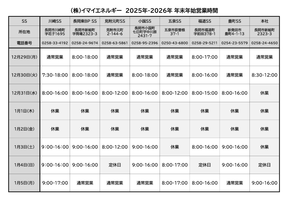 2025年-2026年 年末年始営業時間 お知らせ 2025.12.032025.12.05 年末年始につきまして、各店にて営業時間短縮およびお休みを頂戴いたします。お客様にはご不便をおかけし恐縮いたしますが、ご理解ご協力のほど、どうぞお願い申し上げます。 PDFでご覧になる場合はこちらをクリック。